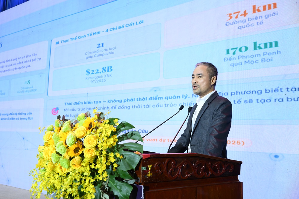 Tiếp nối chuỗi tham luận, TS. Nguyễn Hữu Thi – Chủ tịch iSAM Holdings Management đã đưa ra phân tích sâu về lợi thế địa kinh tế của Tây Ninh, đặc biệt là vị trí cửa ngõ kết nối TP.HCM với Campuchia. Ông đề xuất xây dựng Tây Ninh trở thành trung tâm logistics của vùng Nam Bộ thông qua việc phát triển hạ tầng số trong logistic, tối ưu chuỗi cung ứng và thu hút đầu tư vào các khu công nghiệp – logistics tích hợp. Đồng thời, ông nhấn mạnh tầm quan trọng của dữ liệu và công nghệ trong quản trị logistics hiện đại.