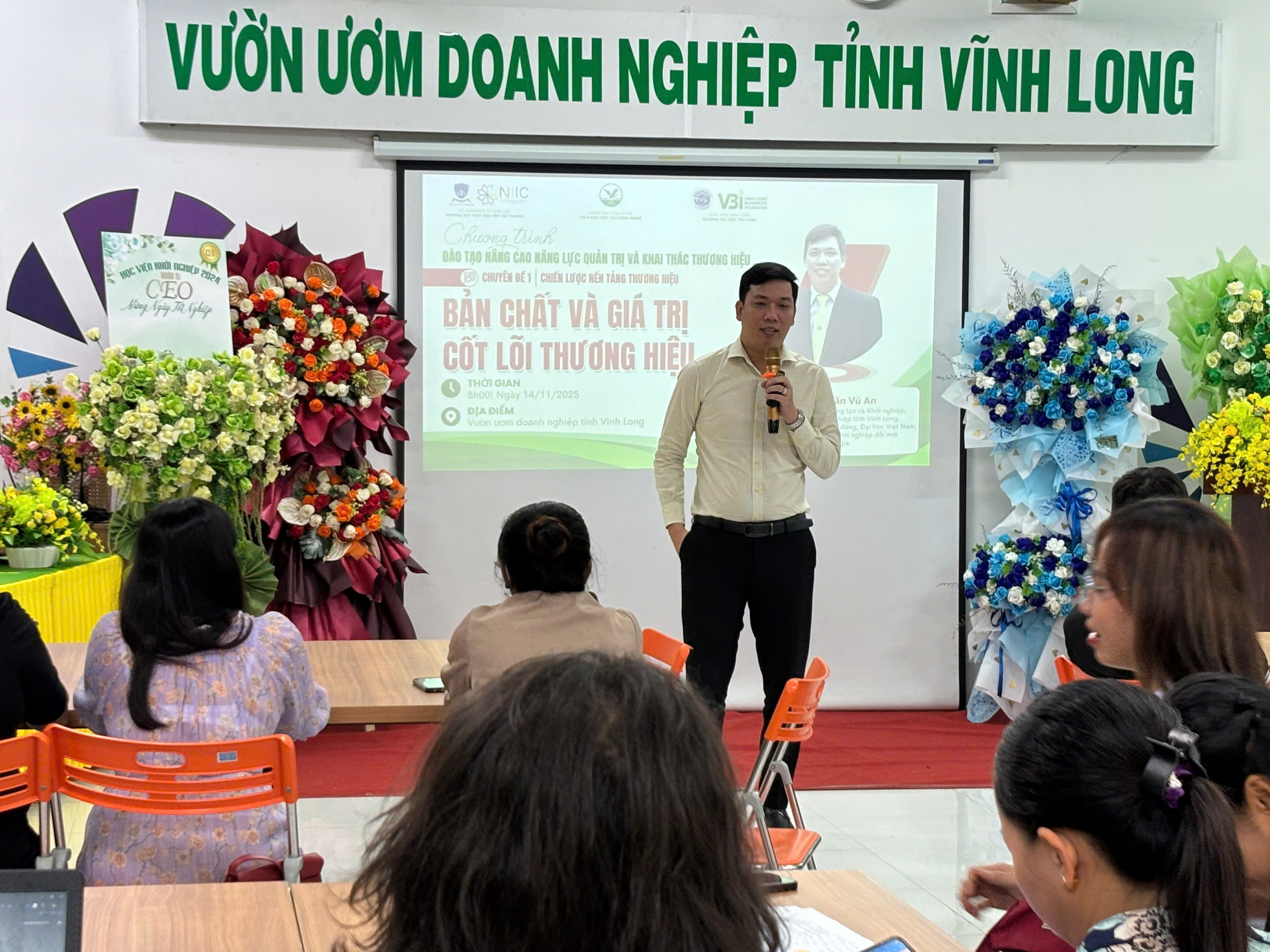 Chuyên đề thứ nhất – “Chiến lược nền tảng thương hiệu” – do ThS. Nguyễn Văn Vũ An, Giám đốc Vườn ươm Khởi nghiệp tỉnh Vĩnh Long kiêm Giám đốc Trung tâm Đổi mới Sáng tạo và Khởi nghiệp, Trường Đại học Trà Vinh, trực tiếp giảng dạy. Với kinh nghiệm sâu rộng trong lĩnh vực chiến lược thương hiệu và đổi mới sáng tạo, ông giúp học viên tiếp cận các mô hình, phương pháp phân tích và thực hành xác định giá trị cốt lõi.