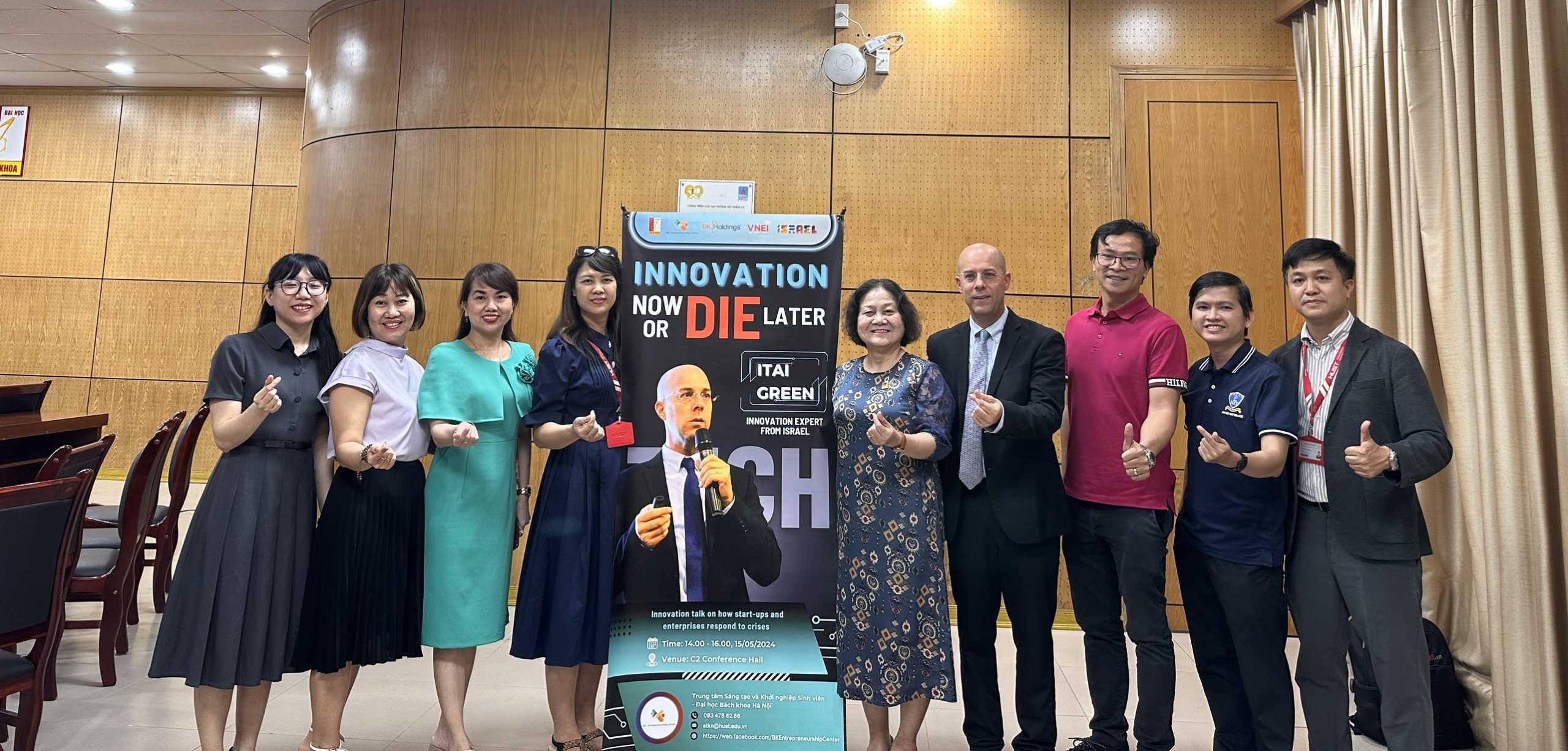 Cũng trong chuyến công tác tại Hà Nội, đoàn Đại biểu Trường Đại học Nguyễn Tất Thành tham dự buổi Talkshow với chủ đề “Innovation now or die later” cùng với chuyên gia hàng đầu về đổi mới sáng tạo đến từ Israel – diễn giả Itai Green tại Đại học Bách Khoa Hà Nội. Thông qua buổi Talkshow, NIIC đã học tập được thêm những kiến thức hay, bổ ích từ diễn giả. Cụ thể là tầm quan trọng của việc Đổi mới Sáng tạo trong thời đại công nghệ đang phát triển với tốc độ rất nhanh.